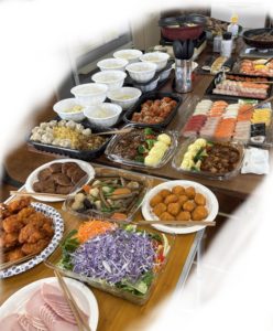 牛肩ロースのシチュー、筑前煮、ロメインレタスサラダ、シュリンプカクテル、