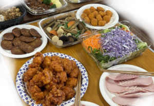 マルシンハンバーグ、bibigo海鮮ニラチヂミ、bibigoキンパ3本セット、